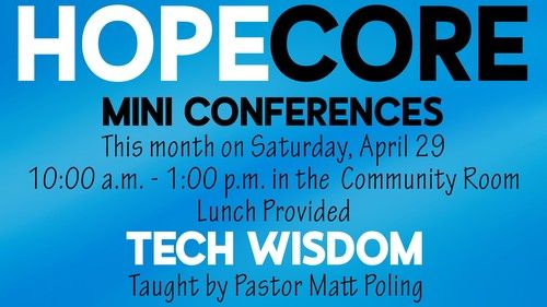 Join us at Hope Community Church as Pastor Matt shares his experiences, failures, and successes, as well as the grace and wisdom he has received from the Lord along the way. We’ll dive into a wide range of topics, including understanding technology, its benefits for us, its dangers and risks, how we can use it wisely, and what the Bible has to say to help us along the way. We’ll also go over some current technology and practices that can help you manage this difficult arena. Finally, we’ll have some time for Q&A.
