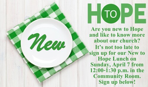 Hope Seniors' Lunch: Sunday, June 2 following the service in the Community Room.