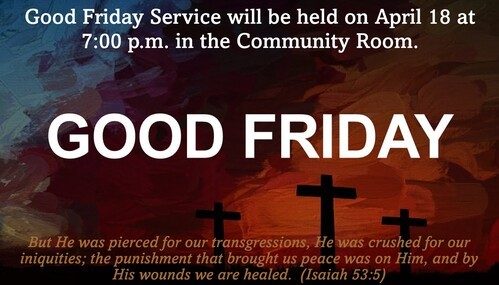 National Day of Prayer - Thursday, May 1 from 6:45 to 8:30 p.m. in the Community Room.