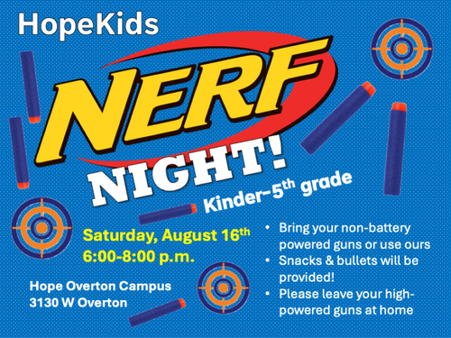 We had a great time at our Family Movie Night! This month we are looking forward to Nerf Night for our Kinder through 5th grade HopeKids. The kids can bring their own non-battery powered guns or use one of ours. We will provide snacks and bullets. We ask that they do not bring high powered guns.