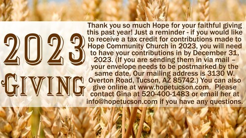 Our next baptism will be Sunday, December 10 following the morning service. If you are interested in being baptized, please contact Gina at info@hopetucson.com.
