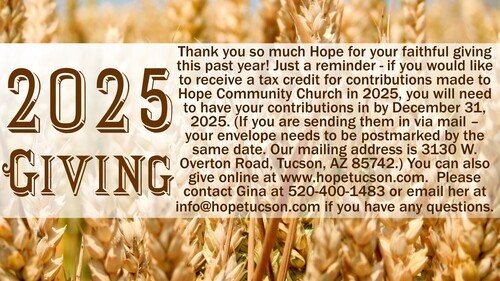Interested in being baptized? We will have a baptism on Sunday, December 7 following Worship Service. Contact info@hopetucson.com if you would like to be baptized.