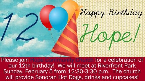 This month we are celebrating our 12th year as a church, and by God’s mercy and kindness, HE continues to use us for His Kingdom and to encourage each other. He has so blessed Hope Community Church! Make sure to join us on Sunday, February 5 at our 10 a.m. Sunday celebration service and then immediately after service at Riverfront Park for fellowship and Sonoran Hot Dogs!
