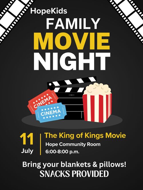 We hope to see you at our HopeKids' Family Movie Night on Friday, July 11th from 6:00-8:00 p.m.! We will be watching "The King of Kings" movie which has had great reviews. You can wear your pajamas and bring your pillows and blankets. We will have plenty of yummy snacks, including popcorn from our new popcorn machine!